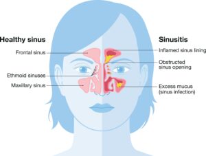 Sinusitis or a sinus infection occurs when the sinuses, the hollow spaces inside your head and nose, become swollen and inflamed. Usually, healthy sinuses are filled with air.